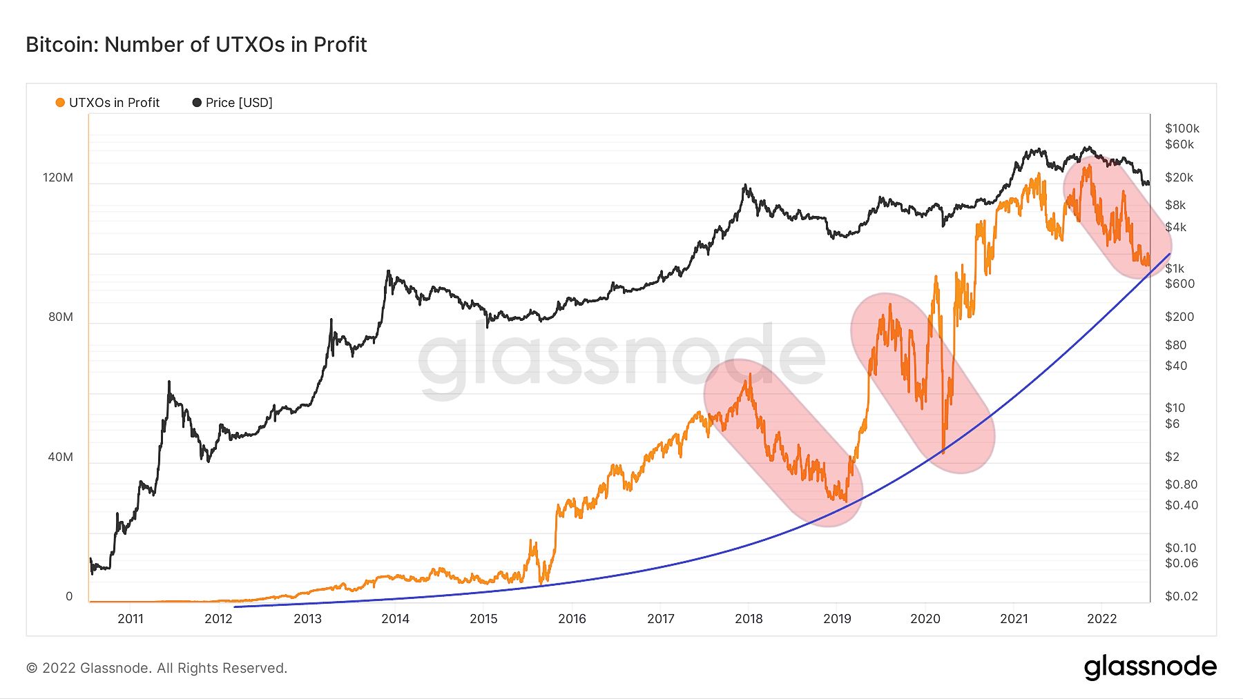 If we now look at the absolute amount of UTXOs in profit, we see that this value has fallen to an almost two-year low. Despite this – as the adoption of the Bitcoin network increases – the indicator remains in a long-term upward trend (blue curve). However, the current correction is the biggest drop since the July 2019 to March 2020 period.