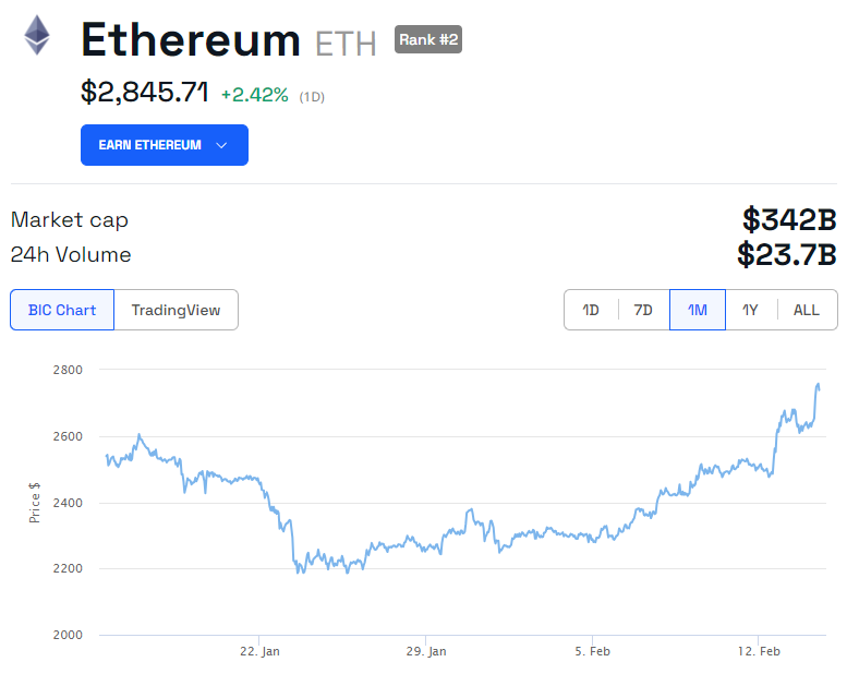 Ethereum was leading markets today with a 2.5% gain, taking it to $2,860, its highest price since May 2022.