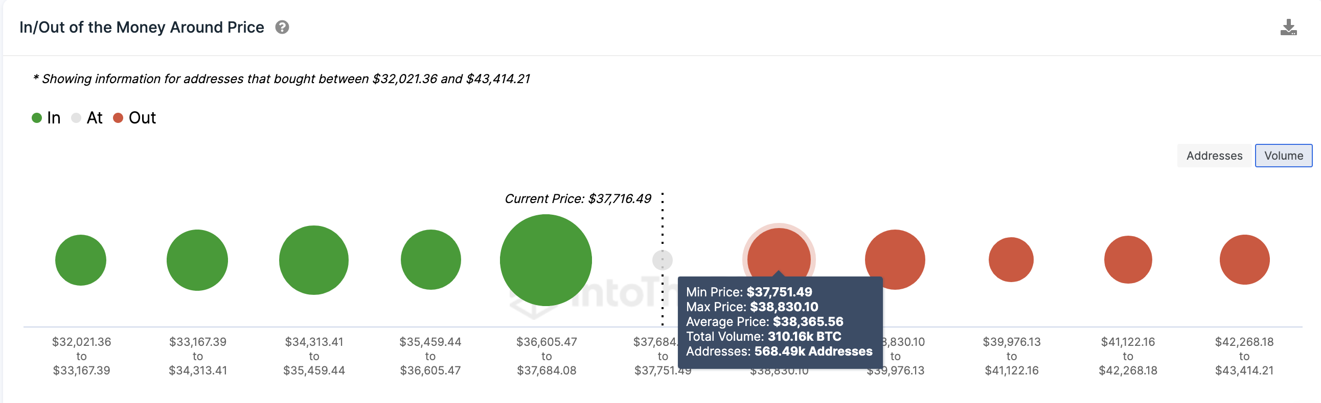 However, it shows that the bulls must scale the initial resistance sell-wall around $38,000 to remain in control. As depicted below, 568,490 addresses had bought 310,160 BTC at the average price of $38,300. They could start selling once the Bitcoin price approaches its break-even point.