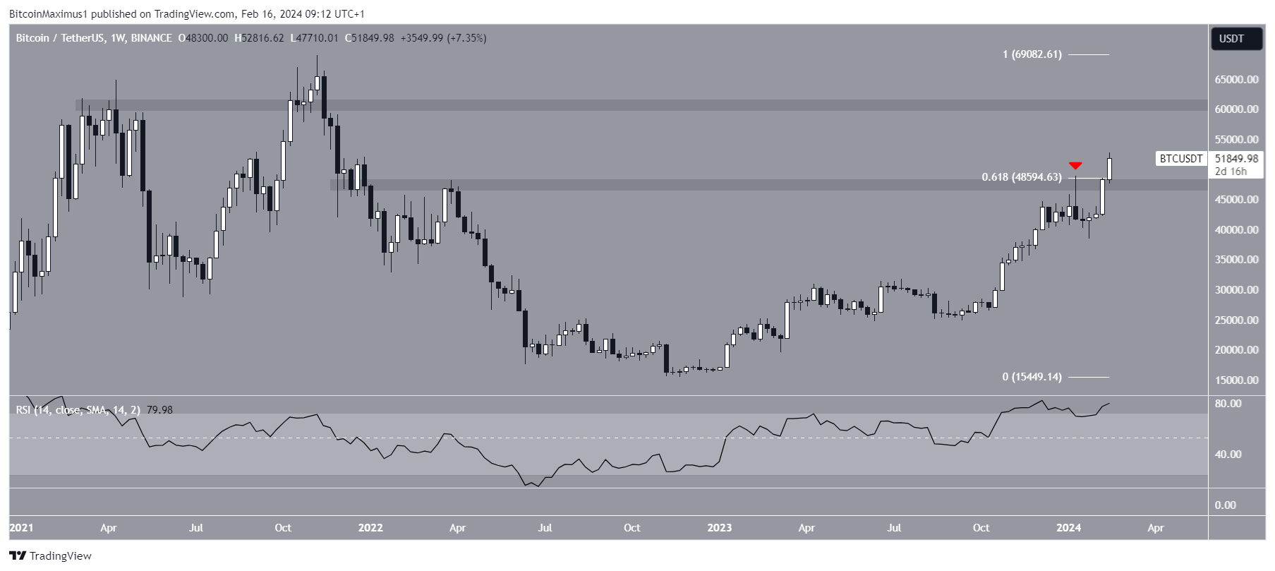 The technical analysis of the weekly time frame shows the BTC price has increased since the start of 2023, accelerating its rate of increase in October. In January 2024, the price reached a high of $48,970 but was rejected, creating a bearish candlestick (red icon). The rejection validated a horizontal and Fib resistance level.