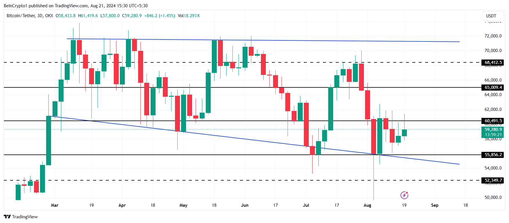 Since the beginning of August, Bitcoin’s price has struggled to rise above $60,000. This is delaying the recovery of investors’ losses from the July crash.