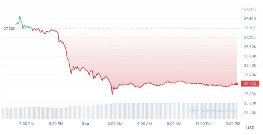 Bitcoin lost all its gains from the Grayscale pump as it fell below the $26,000 price level after a 4.5% depreciation over the last 24 hours. BTC saw a 40% surge in 24-hour trading volume, which highlights that investors are quickly dumping their holdings.