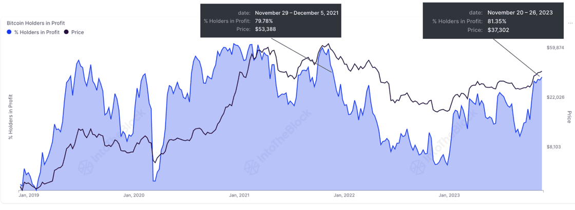 “Over 80% of Bitcoin addresses are currently holding at a profit. This is the highest value since December 2021, when prices were above $50,000 per Bitcoin,” IntoTheBlock said.