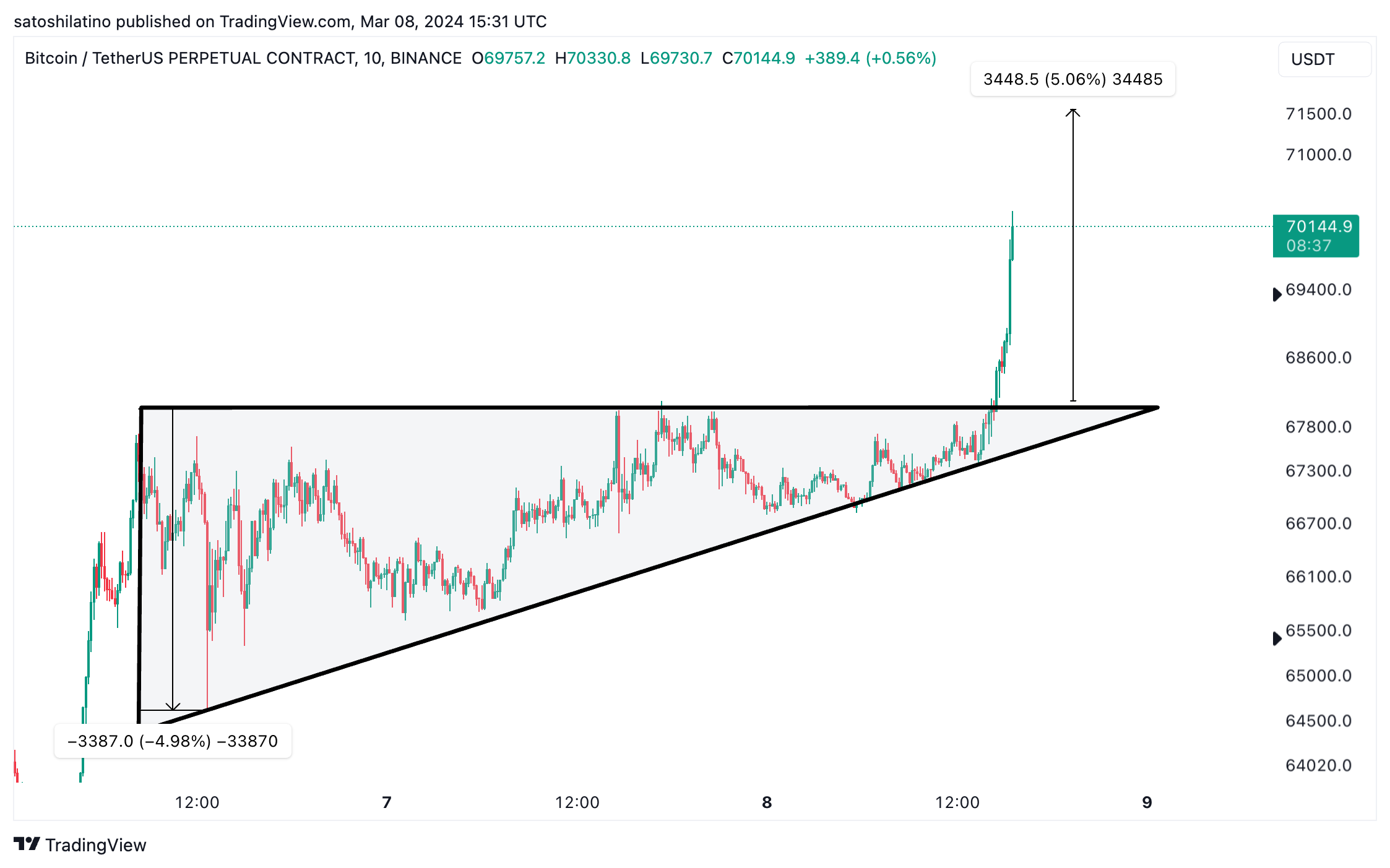 This surge comes from Bitcoin breaking out of an ascending triangle on its 10-minute chart. This technical pattern underscores the digital currency’s bullish momentum and hints at even more growth on the horizon.