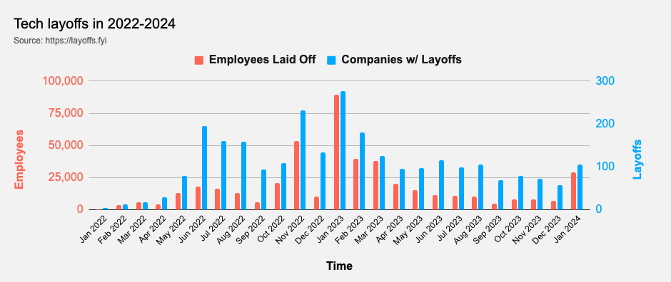 “Big, fat tech oligopolies looking for more growth and profit; there are the medium-size companies that over-hired during boom times; and there are the smaller start-ups that are just trying to gain runway to survive,” said Hyatt.