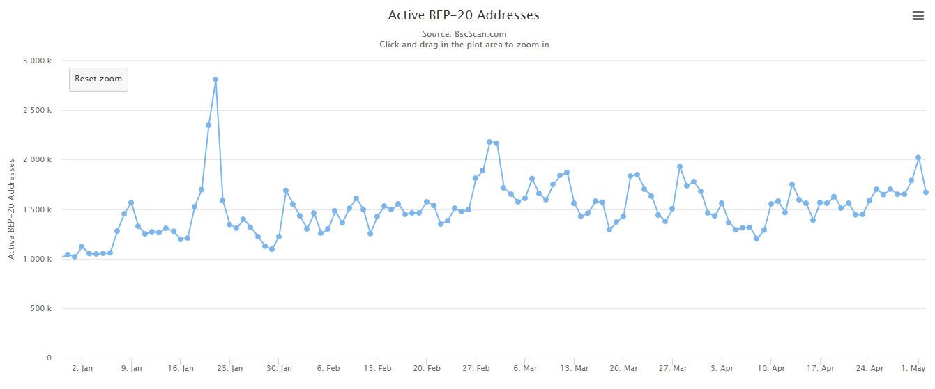 According to the BNB Chain scanner, the total number of active BEP-20 addresses was 1.67 million on May 2. Bscscan also reported that this metric has increased by 64% since the beginning of the year.
