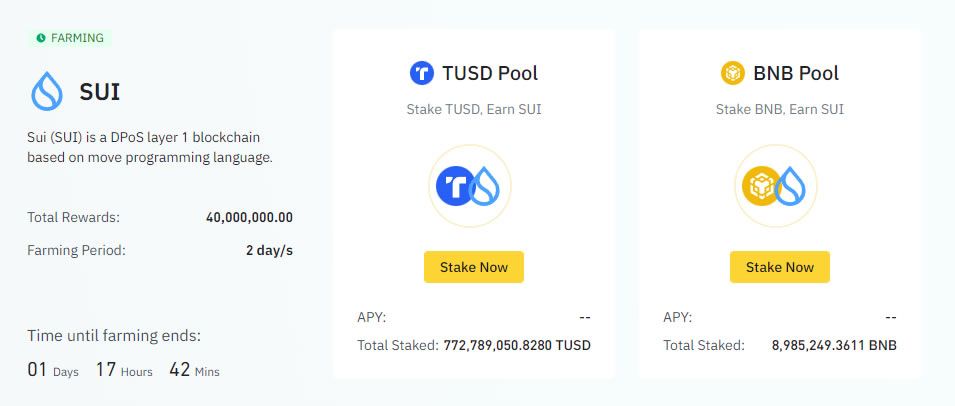 40 million SUI tokens will be issued as rewards for farming the two pools. At the time of writing, 772.8 million True USD had been staked into the TUSD pool. Furthermore, 8.9 million BNB worth almost $3 billion had been staked.