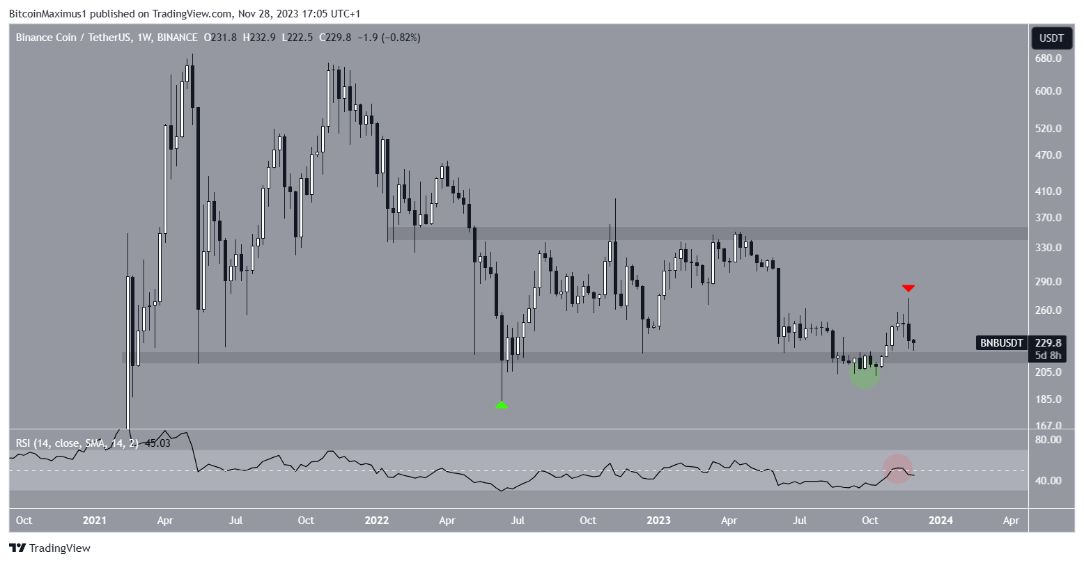 SponsoredThe price initially fell below the area in July 2023 (green circle) but reclaimed the area shortly afterward. The BNB price has increased since.