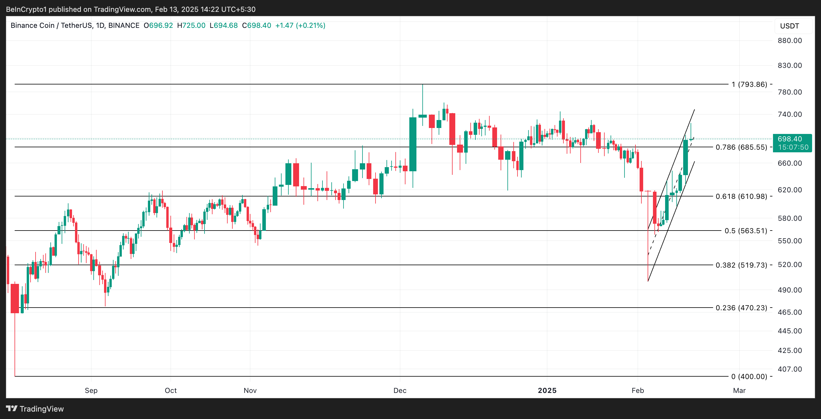 BNB has staged an impressive comeback, surging 40% after hitting a five-month low on February 3. The coin now trades at $698.40, adding 10% to its value over the past day.