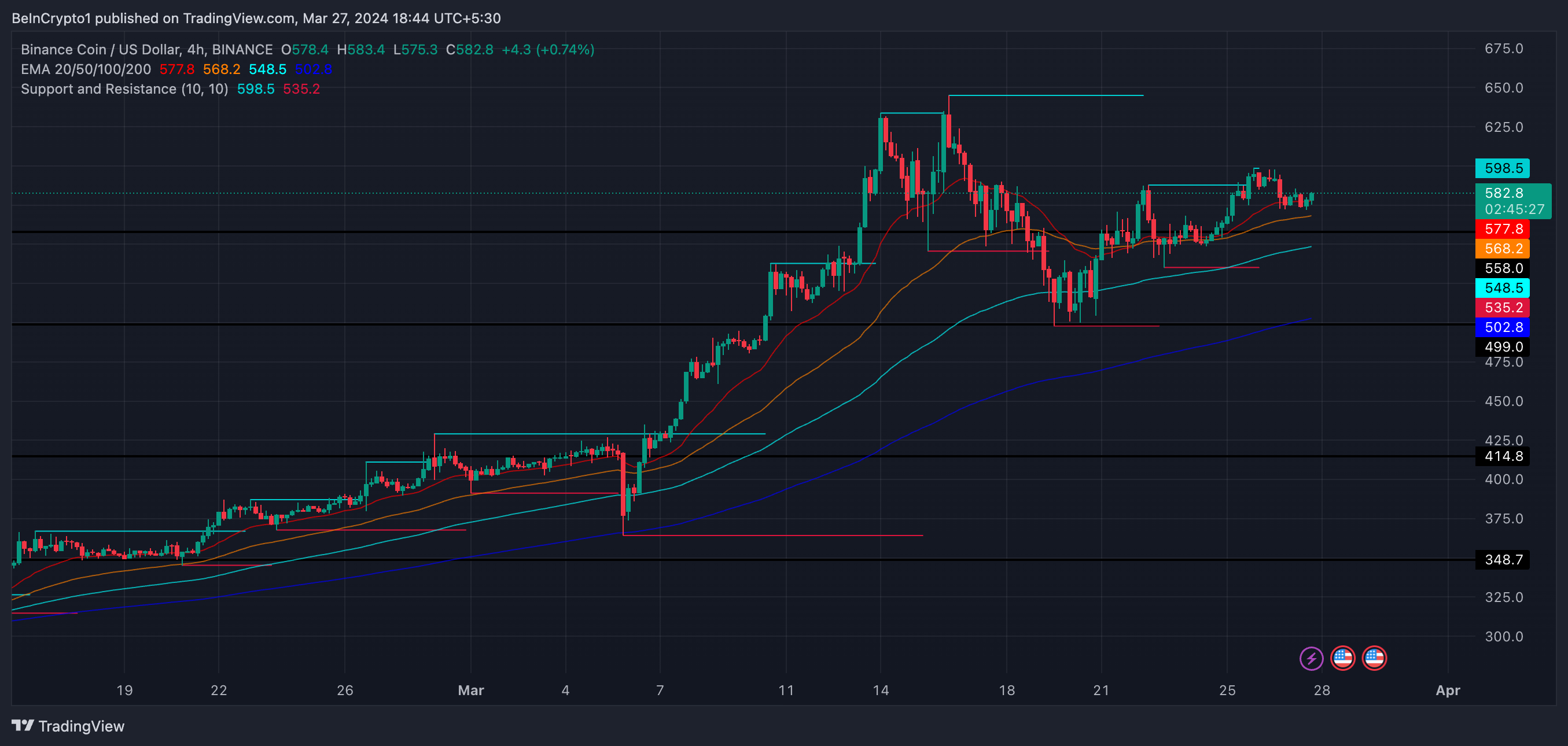 If BNB maintains its current pace and steers clear of a consolidation, the price may challenge and exceed the $645 resistance. These outcomes depend on consistent market conditions and avoiding a price-stabilizing consolidation. Should a decline begin, the BNB price could approach the $497 support.