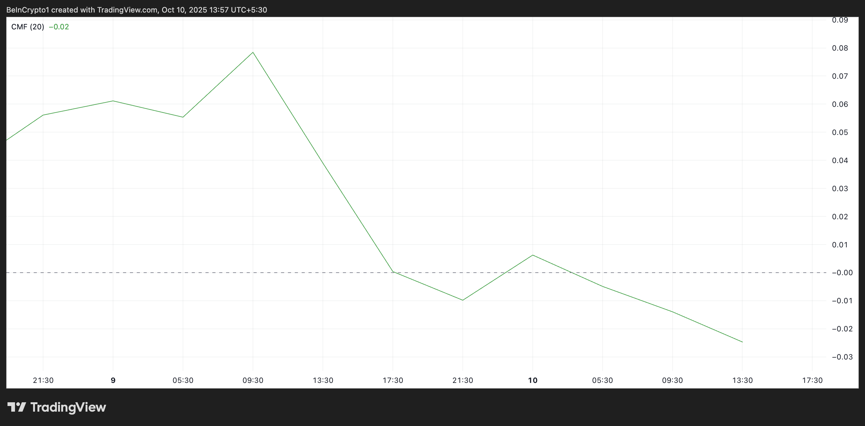 The CMF indicator tracks money flow into and out of an asset. When it falls during a price rally, it forms a bearish divergence.