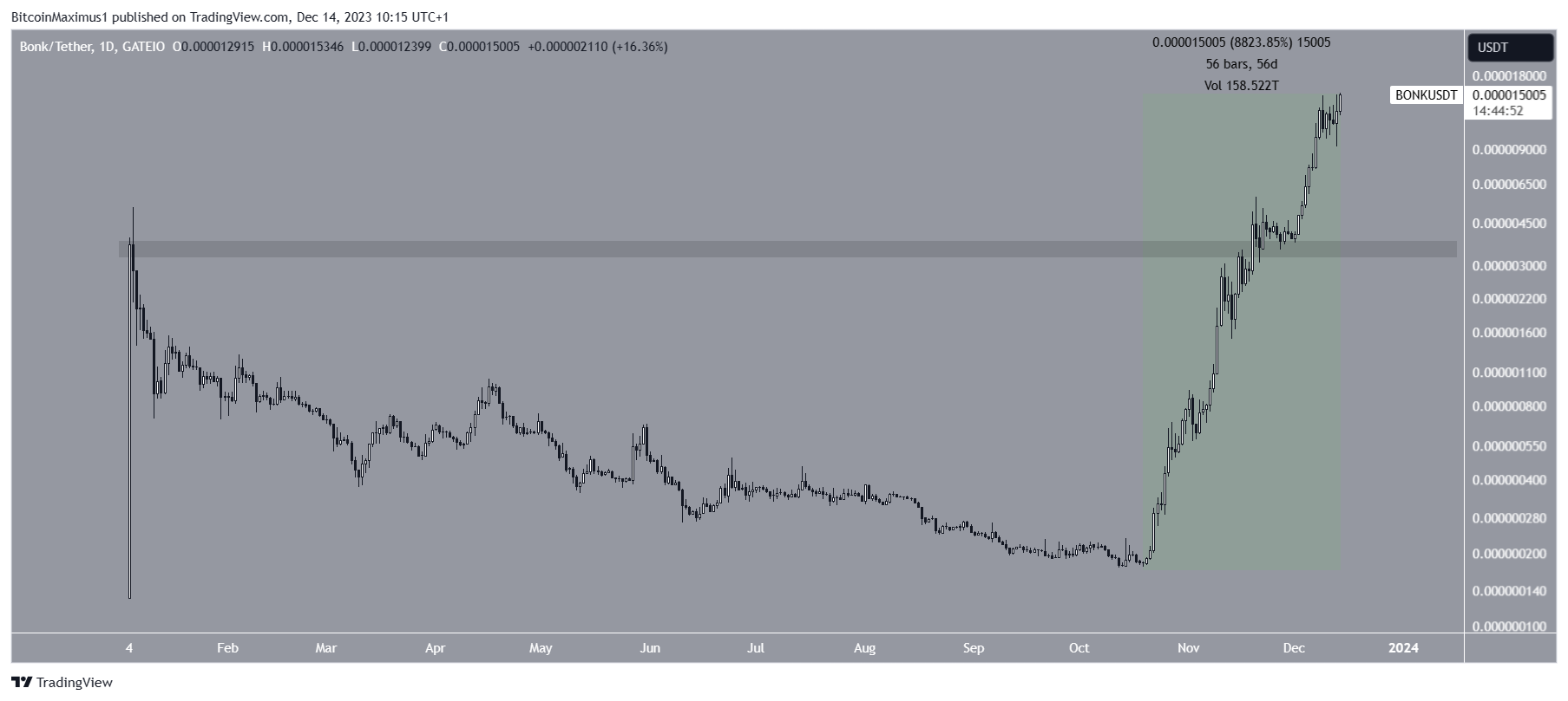 The BONK price has increased quickly since October 20. On November 20, the price broke out from its then-all-time high of $0.0000057. After a brief retracement, which validated the previous all-time high region as support, the BONK price accelerated its upward movement again. It reached a new all-time high of $0.0000150 today.