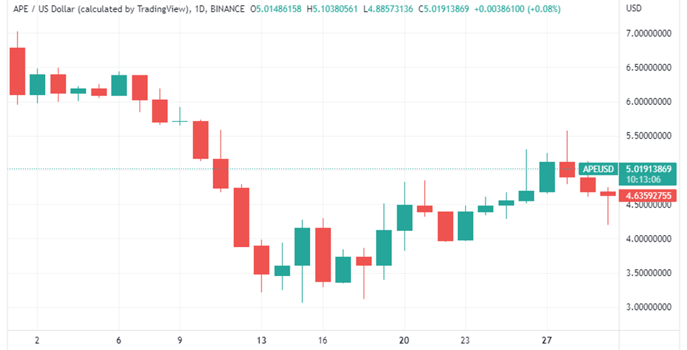 APE opened on June 1, with a trading price of $6.76, reached a monthly high of $7, tested a monthly low of $3.09, and closed the month at $4.62. Overall, this equates to a 31% decrease in the opening and closing price of APE in June.