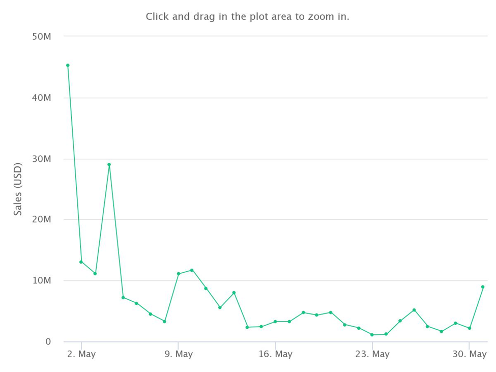 SponsoredAlthough this figure seems impressive due to the sales volume of CryptoPunks, Axie Infinity, Mutant Ape Yacht Club (MAYC), NBA Top Shots, Moonbirds, and Meebits, it was a 63% drop from May’s volume. In May, BAYC sales were about $223.73 million.