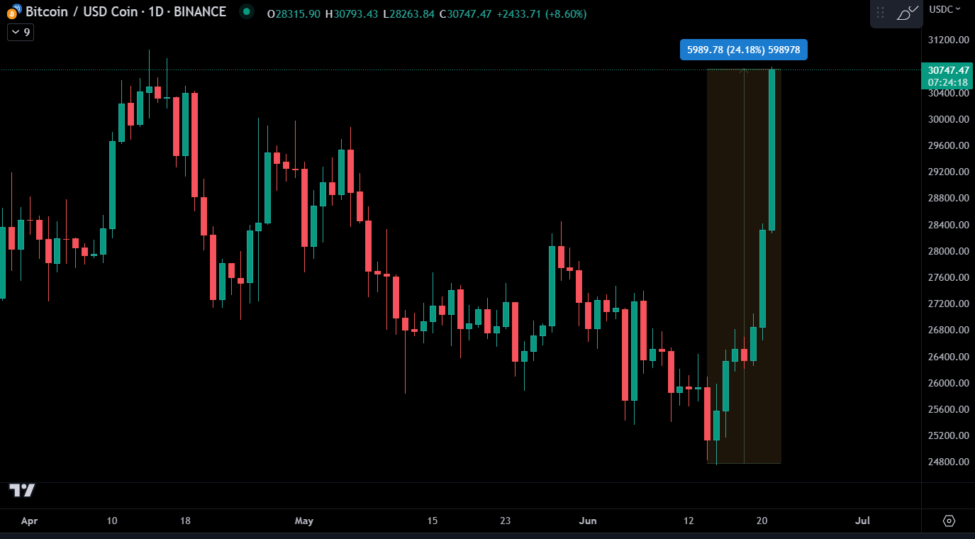SponsoredAt the time of publication, the price of Bitcoin had reached a new two-month high of $30,800.