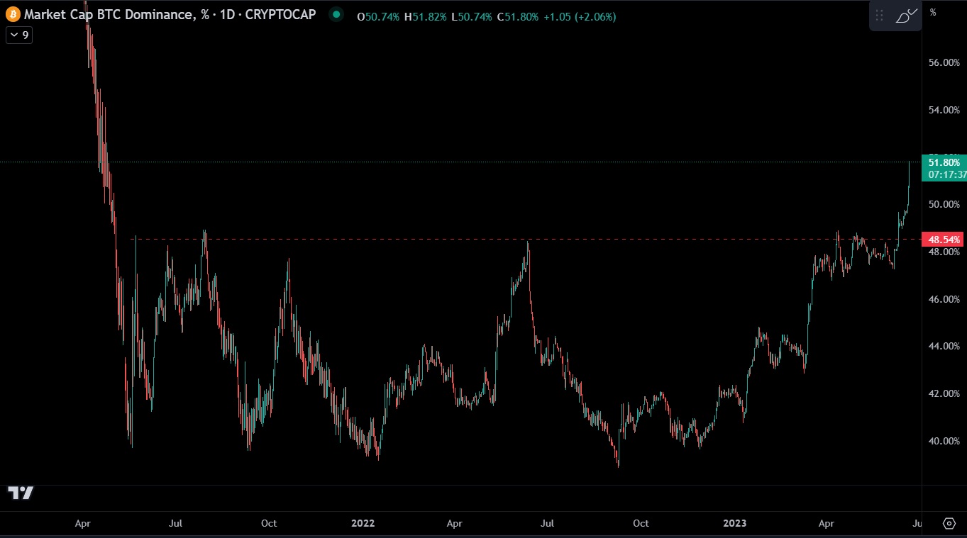 Bitcoin dominance (BTC.D) has experienced a notable surge in the past week, reaching a level above 51%. This represents a significant milestone, marking a two-year high for Bitcoin’s market dominance.