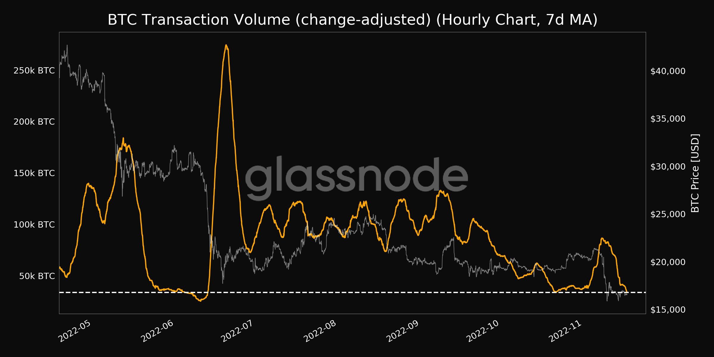 The FTX conundrum pulled Bitcoin price down to the record low of $15,580, last seen in November 2020. The pullback has significantly affected network vibrancy with BTC transaction volume (7d MA) reaching a 5-month low of 33,628.568 BTC.