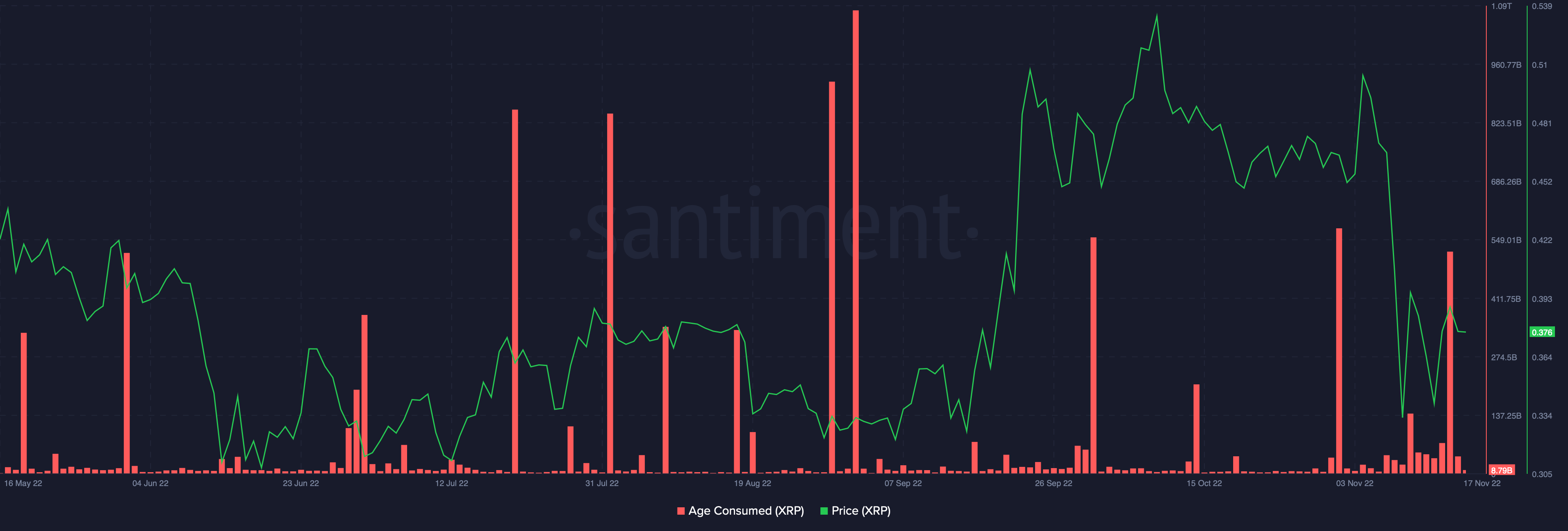 Age consumed metric for XRP showed that over 520 Billion XRP was moved on Nov. 15 as price saw a short-term pump.
