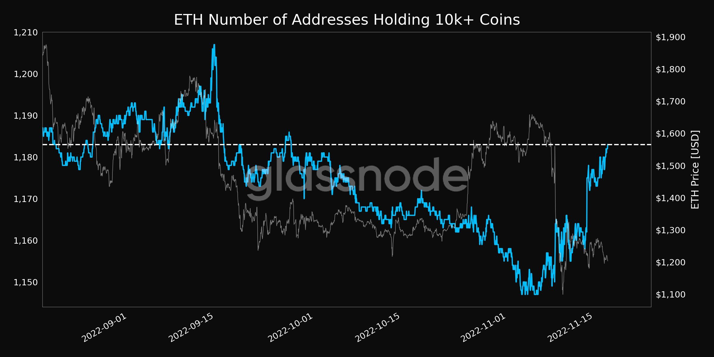 Data from Glassnode further highlighted that ETH Number of Addresses Holding over 10,000 coins just reached a 1-month high of 1,183