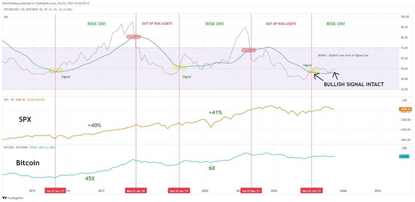 Sponsored SponsoredAccording to the analyst, confirmation of the bull market and the “risk on” period was the upward crossing of the signal line (green) by the monthly RSI indicator for the BTC/SPX pair.