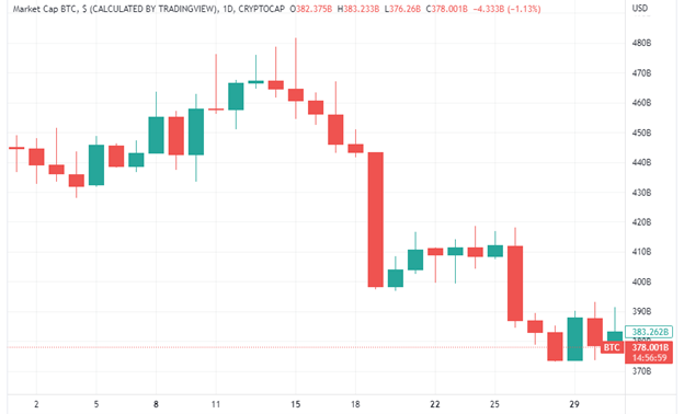 The market value of BTC continues to fall, and August was no different. After making several attempts at recovery in July, BTC opened on Aug. 1 with a market capitalization of $445.23 billion, plunged by 13%, and closed the month with a new market value of $383.71 billion. This saw $61.82 billion wiped off within 30 days.