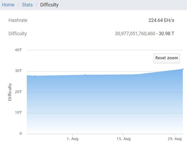 Bitcoin became extremely harder to mine last month. BTC mining difficulty spiked by 9% over the last three weeks, from 28.17 trillion on Aug. 4 to 30.98 trillion on Aug. 31, BTC.com data showed.
