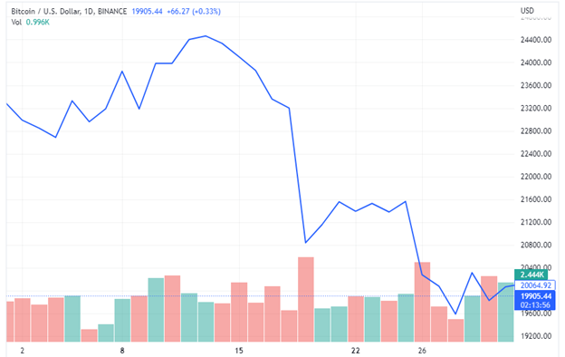 Mining revenue is calculated by multiplying the total number of BTC earned as rewards by the price of the digital asset within a given period. In Aug. 2022, BTC traded in the price range of $19,600.79 and $25,135.59 after opening and closing the month at prices of $23,336.72 and $20,049.76 respectively.