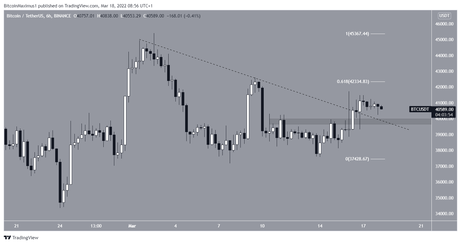 Bitcoin has been trading above an ascending support line since Jan. 22. It rebounded from the support on March 14 (green icon) and created a bullish engulfing candlestick. The price has been moving upwards at a more accelerated rate since, leading to a local high of $41,718 on March 16.Â