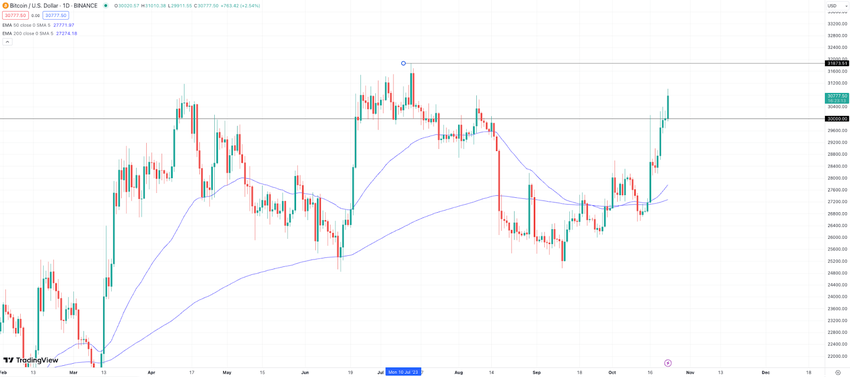 At the time of writing, BTC is trading around the $30,650 level, representing its highest value since August 8.