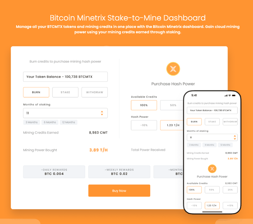 The model works by users purchasing BTCMTX, Bitcoin Minetrix’s native token, and then staking them to earn non-tradable credits.