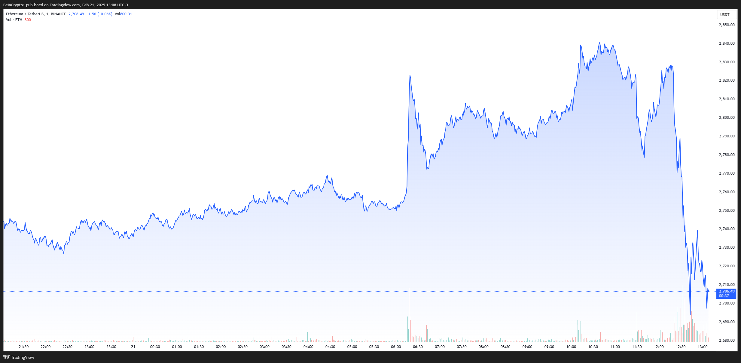 On-chain data shows that a staggering 401,346 ETH (valued at $1.13 billion) was reportedly transferred from Bybit’s hot wallet to an unknown wallet address. The amount is now being liquidated, which also immediately impacted Ethereum’s market price.