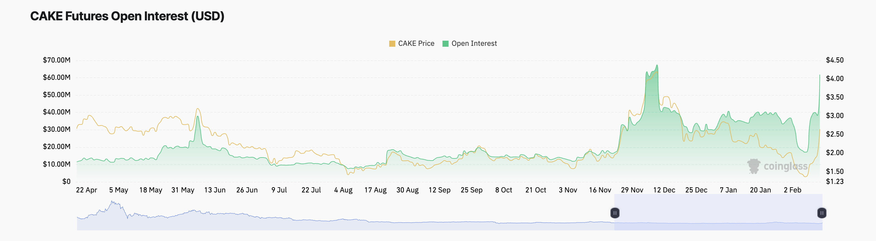 SponsoredAnother indicator of the rise in CAKE’s demand over the past 24 hours is its open interest. It has climbed by 61% during that period to a three-month high of $61 million at press time.
