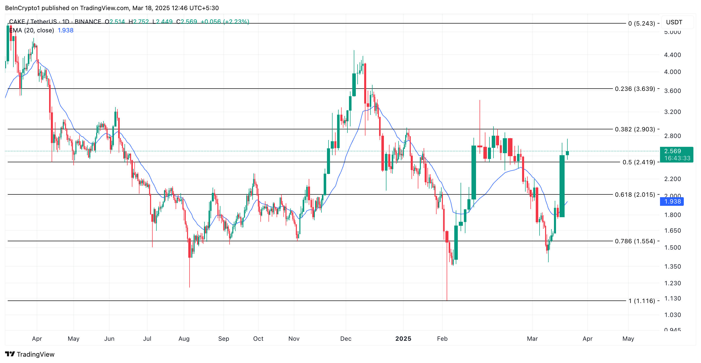 CAKE’s rally has pushed it significantly above its 20-day exponential moving average (EMA) which now forms dynamic support below its price at $1.93.