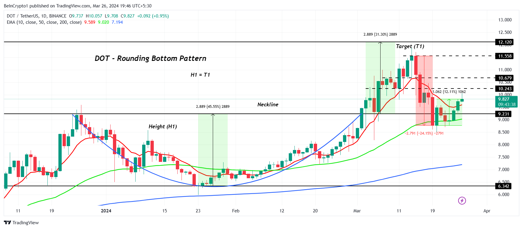 The bullish cues suggest that Polkadot price is certainly on the path of recovery and will continue rising. Over the past few weeks, the altcoin could be seen forming a rounding bottom pattern. This bullish reversal pattern suggested a potential rally of 31%, placing the target price at $12.