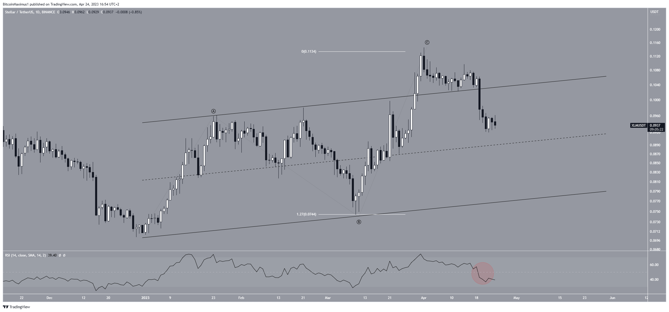There are numerous reasons for this. Firstly, the XLM price fell inside an ascending parallel channel’s confines after moving above it. Whenever the price deviates above a resistance level and falls below it afterward, it is considered a sign of weakness, since the breakout could not be sustained. A sharp downward movement often follows this, as was the case in XLM.