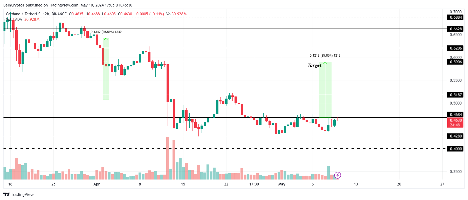 Cardano’s price, trading at $0.46 at the time of writing, is close to closing above the resistance at $0.46. Flipping it into support is key, enabling ADA to rise to $0.50. The altcoin has only breached it twice but never exceeded the month-long resistance at $0.51.