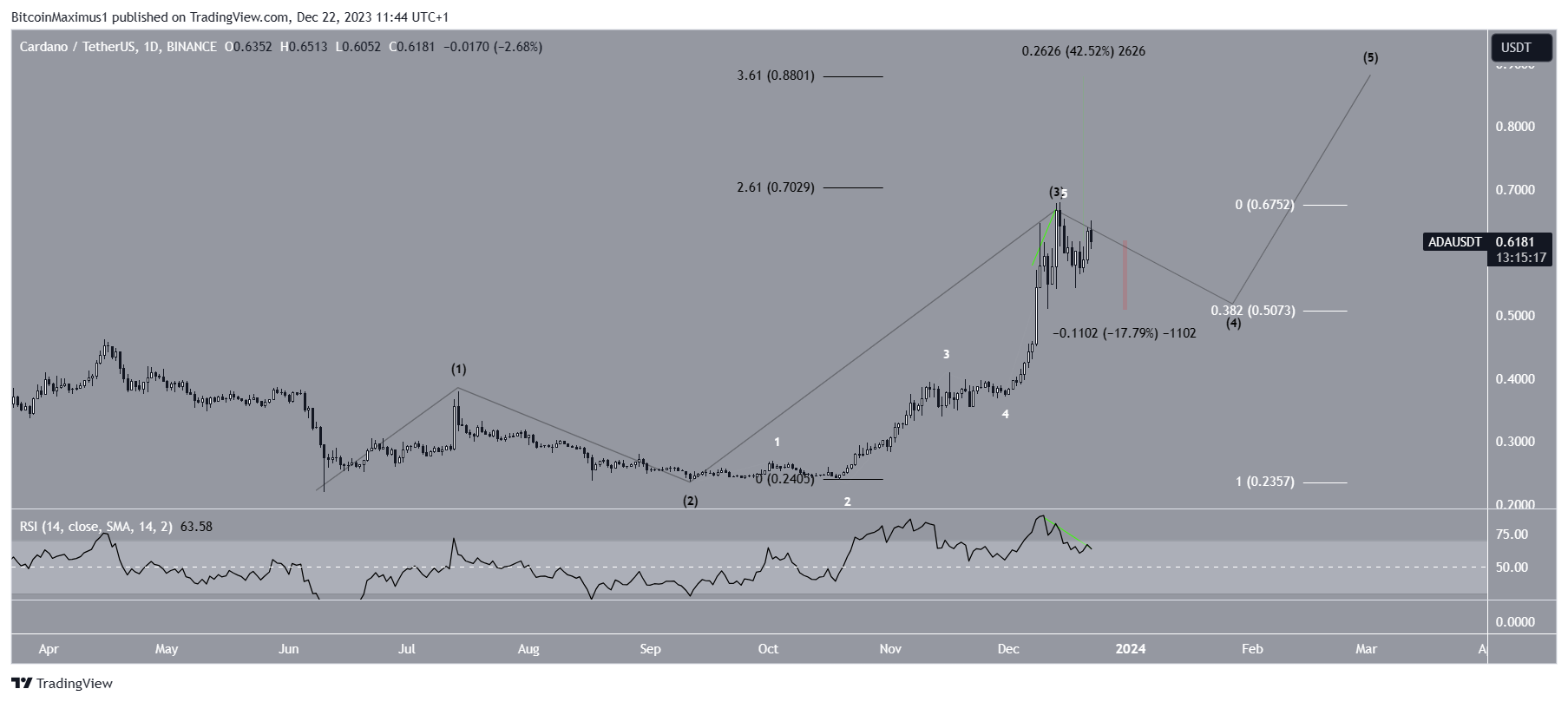 The Cardano (ADA) price has fallen since reaching a new yearly high of $0.68 on December 14.