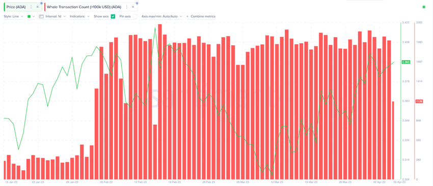 Notably, it has recently surged from 1,654 on March 5, to 2,007 whale transactions recorded as on April 4.