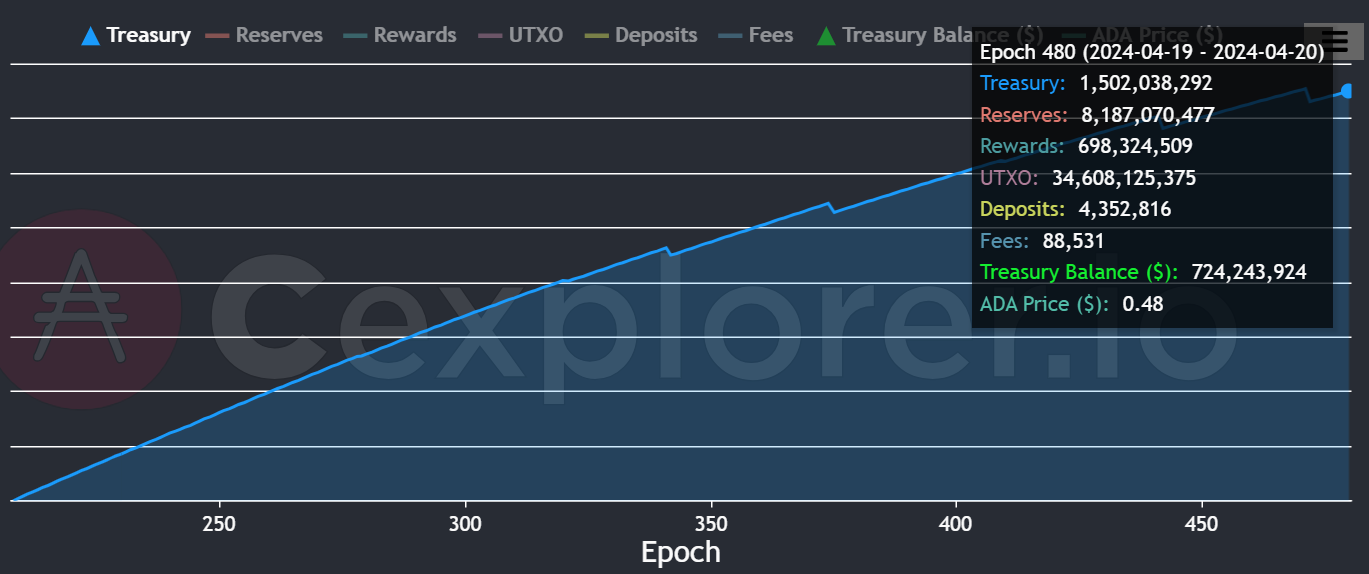 Cardano’s Treasury has hoarded 1.5 billion ADA tokens, worth over $720 million, which constitutes over 4% of the circulating supply.