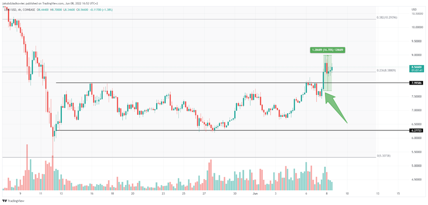 Shortly after the publication of the entry, the price of the LINK token increased by almost 17% measured for the extreme values of the wicks. The rise started from the $7.77 level (green arrow) and after a few hours a local peak at $9 was reached.