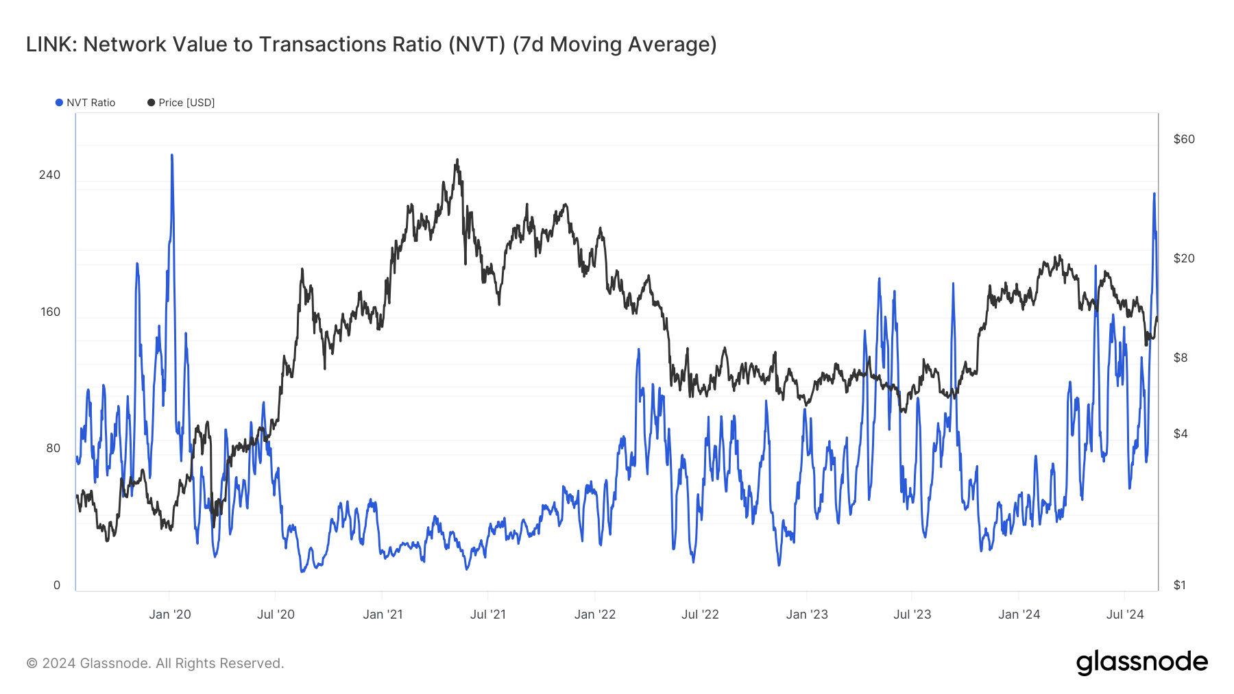 The elevated NVT ratio suggests that LINK is highly overvalued compared to its actual network activity. This could indicate that the price has run too far ahead of the underlying fundamentals.