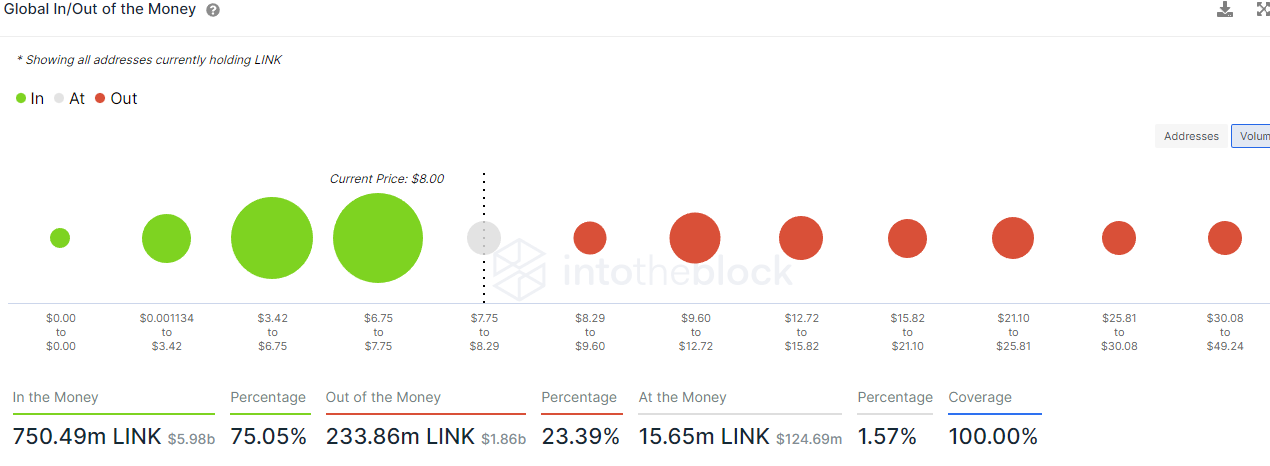 For now, bulls would need to keep LINK’s price above the $7.95 mark where over 15 million LINK are held by 9,370 addresses. The next solid supply barrier as per Global In and Out of Money is at the $8.92 mark where over 13 million LINK is held by over 15,000 addresses.