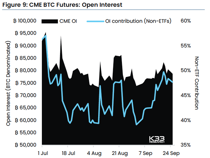OI in Bitcoin (BTC) futures on the CME fell to 78,755 BTC at the time of writing, after peaking at 83,350 on Sept. 19. The broader BTC perpetual futures market also saw a relatively quiet week, with open-interest fairly flat at 274,000 BTC.