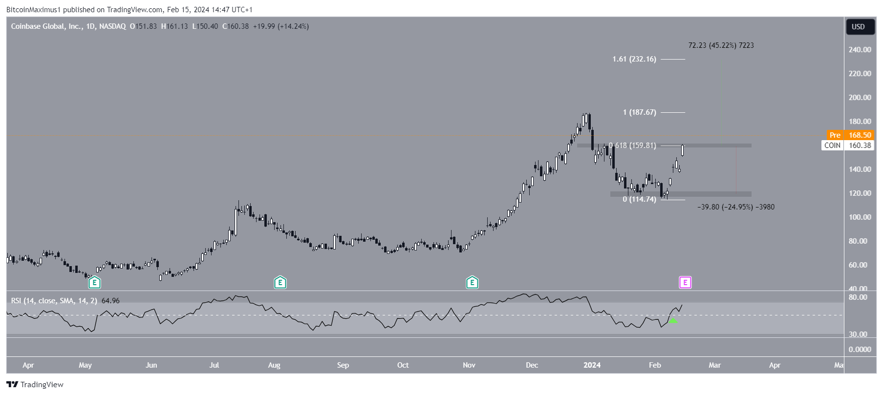 However, the premarket price of COIN is currently at $168, considerably above the 0.618 Fib retracement resistance level.