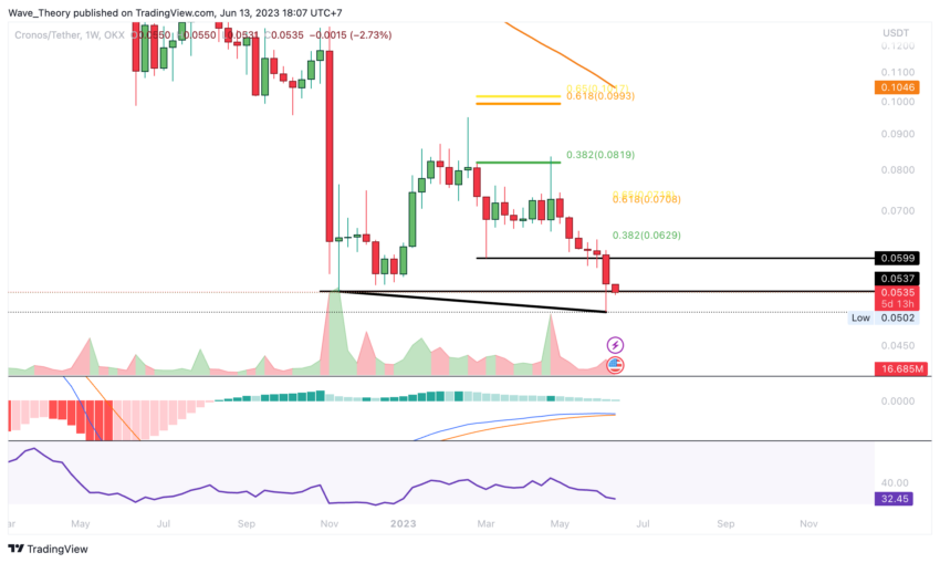 The CRO price experienced a significant drop of over 18% during the previous week. The price of CRO fell below the support zone ranging between approximately $0.0537 and $0.06.
