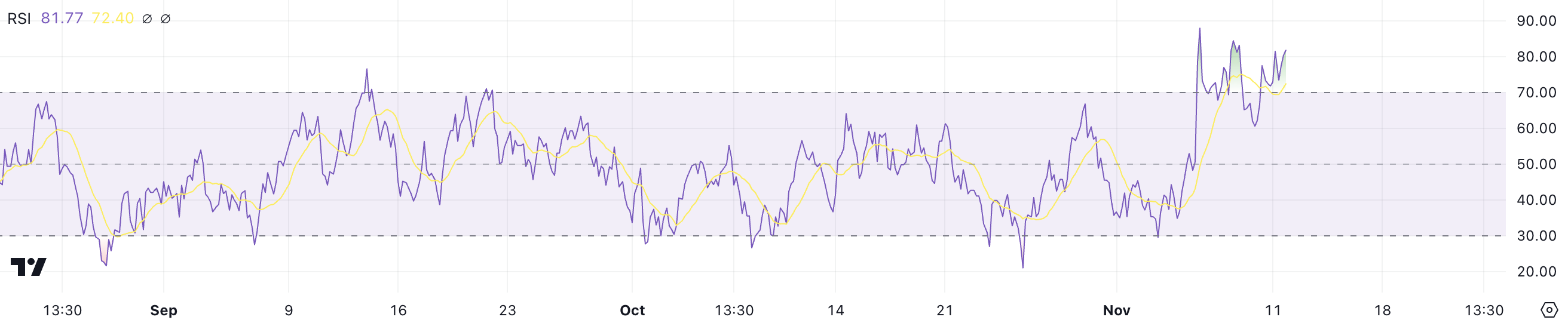 Such a high RSI value suggests that the asset may be overextended. That means that the risk of a price pullback has increased. When an RSI reaches levels above 70, it often indicates that the asset might be overvalued. When that happens, a correction could be on the horizon as traders begin to take profits.