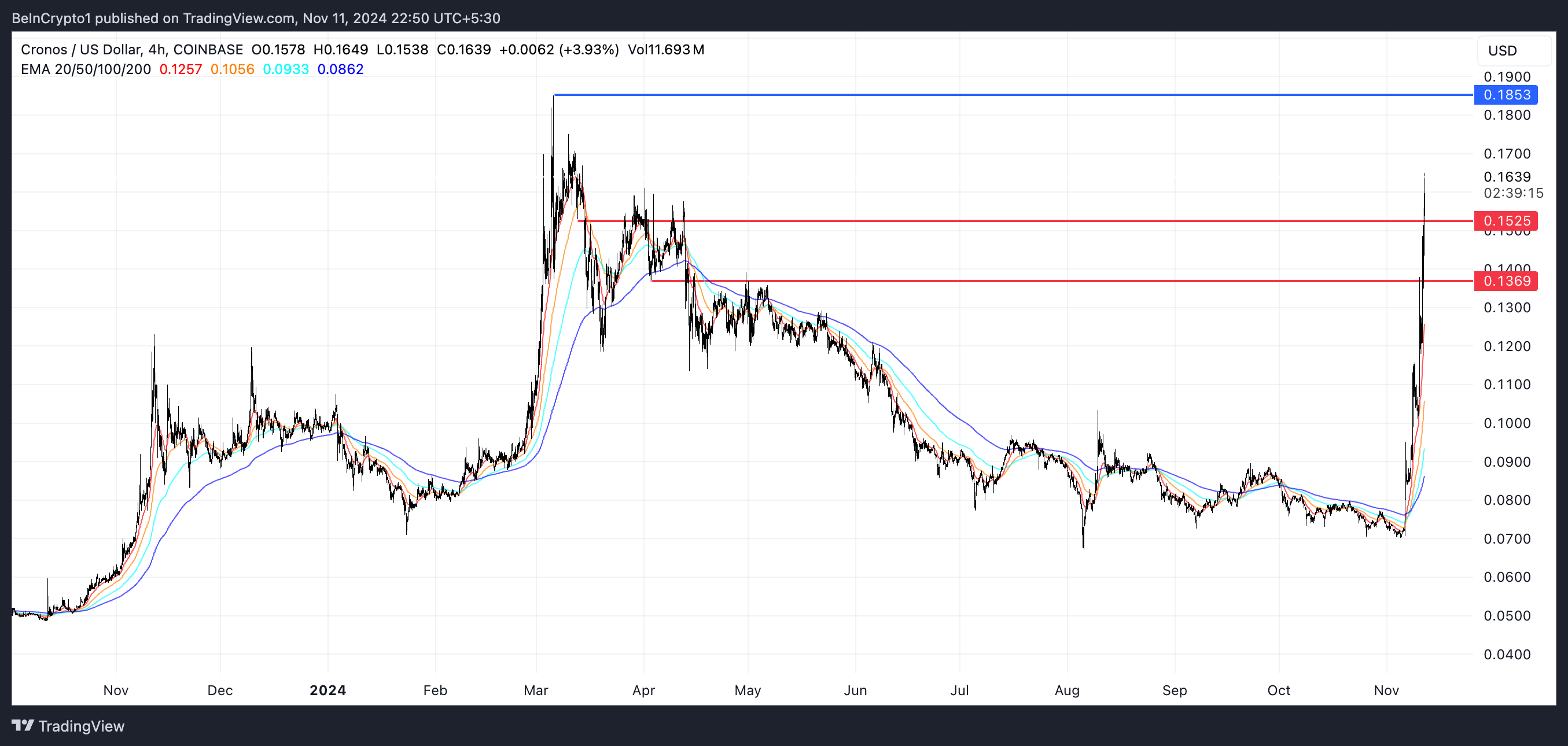 CRO price nearest significant resistance is located at $0.185, and if the current uptrend continues, it could challenge this level soon. Breaking through this resistance would push CRO to its highest price since March 2024.