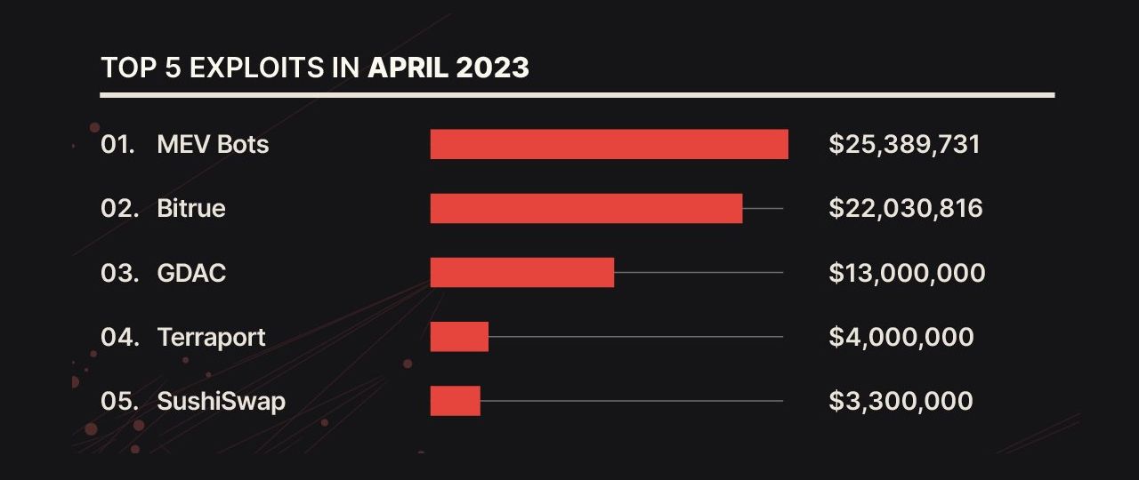 The single largest attack was that of MEV Bots, which suffered $25.3 million in losses due to an exploit. Bitrue and GDAC followed with $22 million and $13 million, also because of exploits.