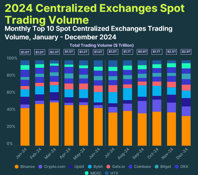 The achievement marked Binance’s second $1 trillion volume month in 2024. Over the course of the year, Binance’s dominance was even more pronounced, capturing 42.4% of the total volume among the top 10 exchanges, with $7.4 trillion traded compared to the $17.4 trillion in total volume for the group.
