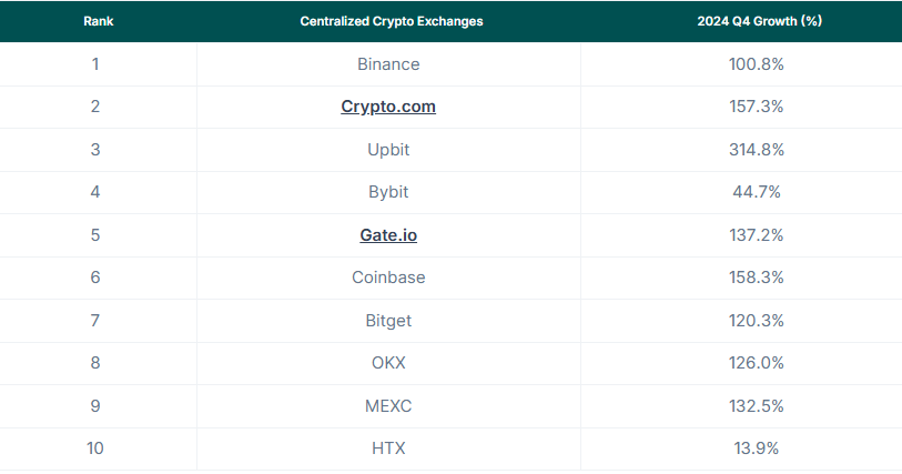 According to a CoinGecko report, in Q4 2024, the overall trading volume of the top 10 crypto centralized exchanges (CEX) surged, with eight of them recording triple-digit percentage growth.